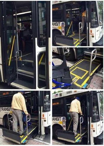 比如在公交車車門處,還有這么一個為殘疾人設置的功能,在臺階那里藏有一塊可伸縮和升降的平臺,殘疾人只要站上去就把殘疾人和殘疾車直接升降運送到公交車的車廂里面。很人性化。