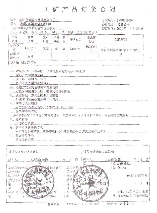 2008年10月28日中國(guó)人民解放軍總參三部物資處3名解放軍干部來(lái)我公司實(shí)地考察。考察比較后對(duì)我公司的規(guī)模和產(chǎn)品給予了極大的肯定,并就一直聯(lián)系的要購(gòu)買(mǎi)的25臺(tái)鋁合金升降機(jī)簽訂了訂貨合同。現(xiàn)我公司已按照約定如期交貨,總參三部驗(yàn)收后非常滿意,并已全部付款到位。